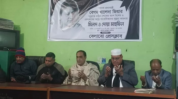 সাবেক প্রধানমন্ত্রী ও বিএনপির চেয়ারপারসন বেগম খালেদা জিয়ার মৃত্যুতে রাষ্ট্রিয় শোকের অংশ বিশেষ ও বেলাব প্রেসক্লাবের অসুস্থ সাংবাদিকদের সুস্থতা কামনায় মিলাদ ও দোয়া মাহফিল অনুষ্ঠিত হয়েছে।