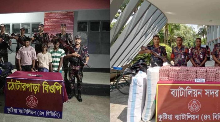 দৌলতপুর প্রতিনিধিঃকুষ্টিয়ার দৌলতপুর সীমান্তে কুষ্টিয়া ব্যাটালিয়ন (৪৭ বিজিবি) মাদক ও চোরাচালান বিরোধী ধারাবাহিক অভিযানে আসামীসহ ইয়াবা, মোটরসাইকেল, মোবাইল ফোন, সীমকার্ড, নগদ অর্থ এবং বিপুল পরিমাণ নকল বিড়ি উদ্ধার করেছে। বিজিবি