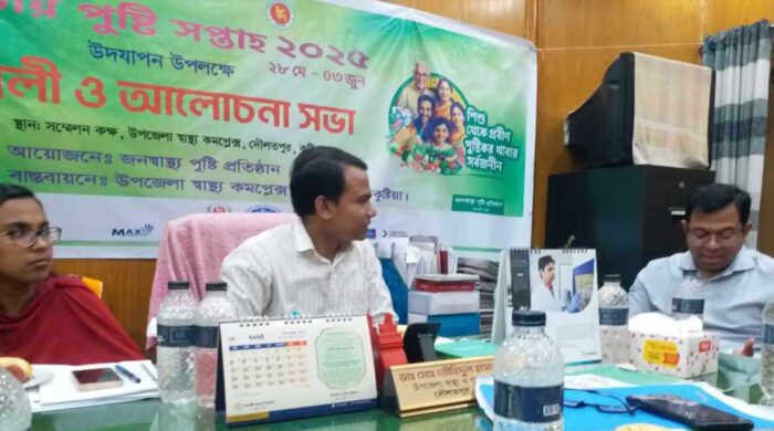 দৌলতপুর প্রতিনিধিঃ কুষ্টিয়ার দৌলতপুর উপজেলা স্বাস্থ্য কমপ্লেক্স মিলানাশতনে শনিবার বেলা ১১ টায়।জাতীয় পুষ্টি সপ্তাহ উদযাপন উপলক্ষে এক প্রস্তুতি সভা অনুষ্ঠিত হয়। দৌলতপুর উপজেলা স্বাস্থ্য ও পঃ পঃ কর্মকর্তা ডাক্তার তৌহিদুল