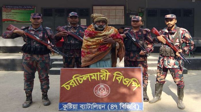 কুষ্টিয়ার দৌলতপুর সীমান্ত এলাকা থেকে এম বাবু (৪৮) নামে একজন ভারতীয় নাগরিককে আটক করেছে বর্ডার গার্ড বাংলাদেশ (বিজিবি)। বুধবার দুপুর আনুমানিক ১ টার দিকে নায়েক মো. আসাদুজ্জামানের নেতৃত্বে বিজিবি’র টহল