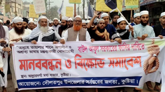 খন্দকার জালাল উদ্দিন: কুষ্টিয়ার দৌলতপুর উপজেলার আল্লার দর্গায় বাউল আবুল সরকারের ফাঁসির দাবিতে মানববন্ধন ও বিক্ষোভ মিছিল অনুষ্ঠিত হয়েছে। ২ ডিসেম্বর বিকেল সাড়ে চারটার দিকে আল্লার দর্গা মধ্যবাজার এলাকায় এই