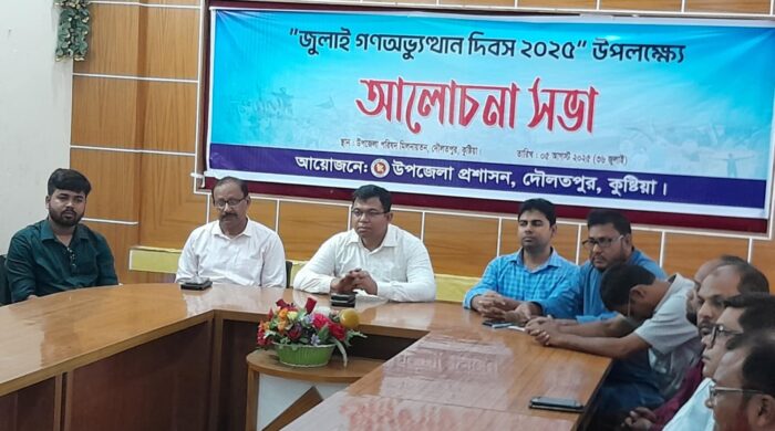 নিজস্ব প্রতিনিধি : কুষ্টিয়ার দৌলতপুর উপজেলায় উপজেলা প্রশাসনের আয়োজনে উপজেলা পরিষদ মিলন আয়তনে জুলাই গণঅভ্যুত্থান দিবস উপলক্ষে আলোচনা সভা ও দোয়া অনুষ্ঠিত হয়েছে। উক্ত অনুষ্ঠানে সভাপতিত্ব করেন উপজেলা নির্বাহী অফিসার