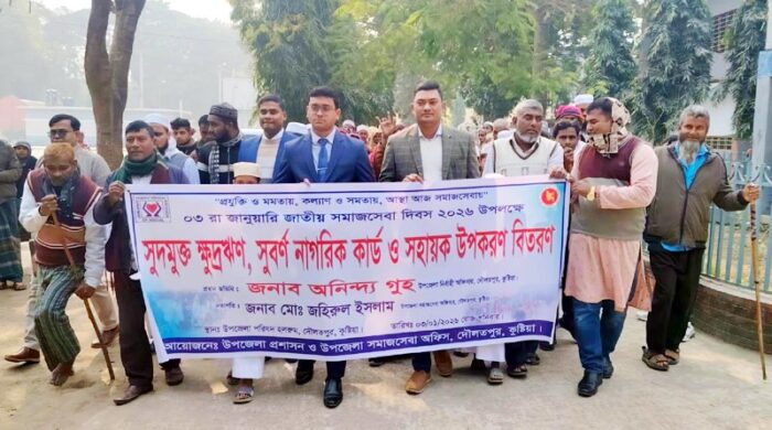 ‘প্রযুক্তি ও মমতায়,কল্যান ও সমতায়, আস্থা আজ সমাজসেবায়’ প্রতিপাদ্যে কুষ্টিয়ার দৌলতপুরে জাতীয় সমাজসেবা দিবস পালন করা হয়েছে। দিবসটি উপলক্ষে শনিবার সকালে উপজেলা প্রশাসন ও উপজেলা সমাজসেবা কার্যালয়ের আয়োজনে একটি বর্ণাঢ্য